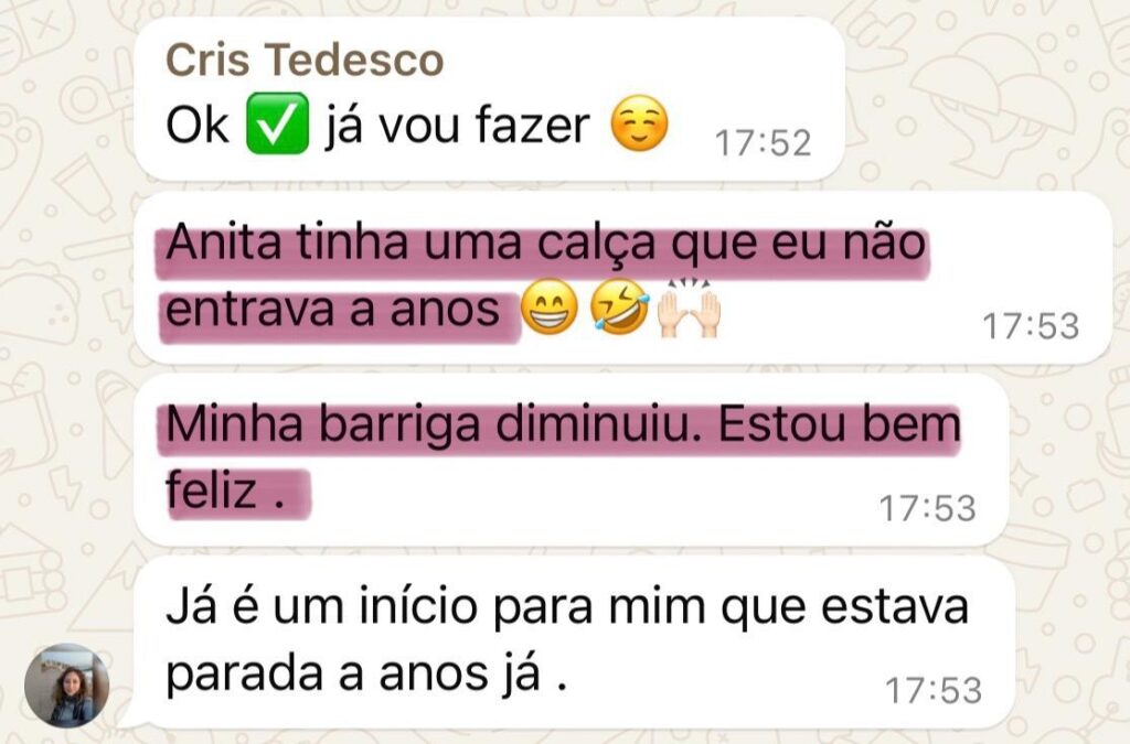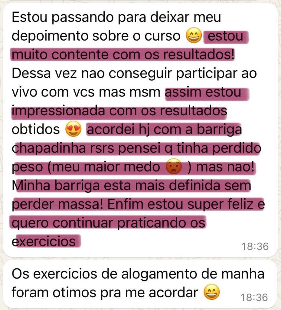 Os resultados variam de pessoa para pessoa, mas muitas alunas relatam sentir diferença já nas primeiras semanas – seja na postura, no abdômen mais firme ou na sensação de bem-estar. Seguindo o método corretamente, você notará mudanças visíveis no espelho ao longo do programa.